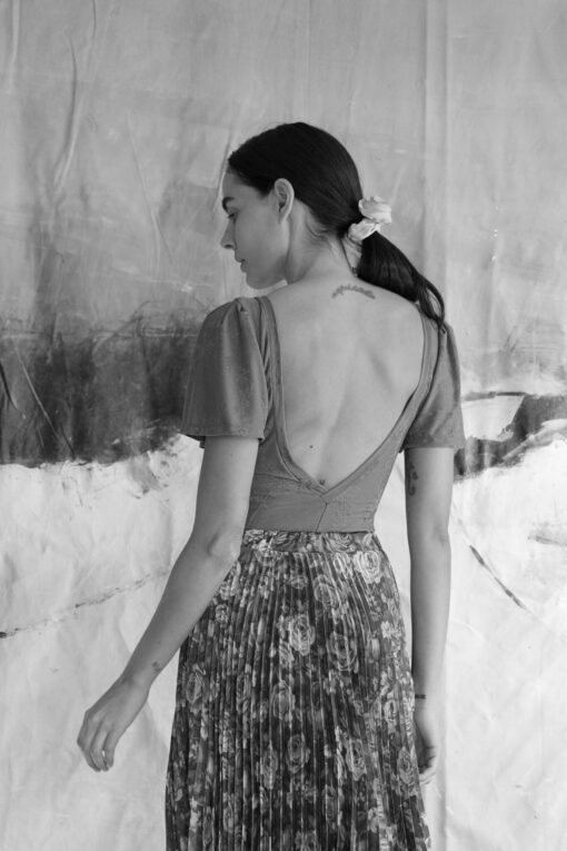 Day-to-night body with v-neck,an open back and little details of embroidered flowers.