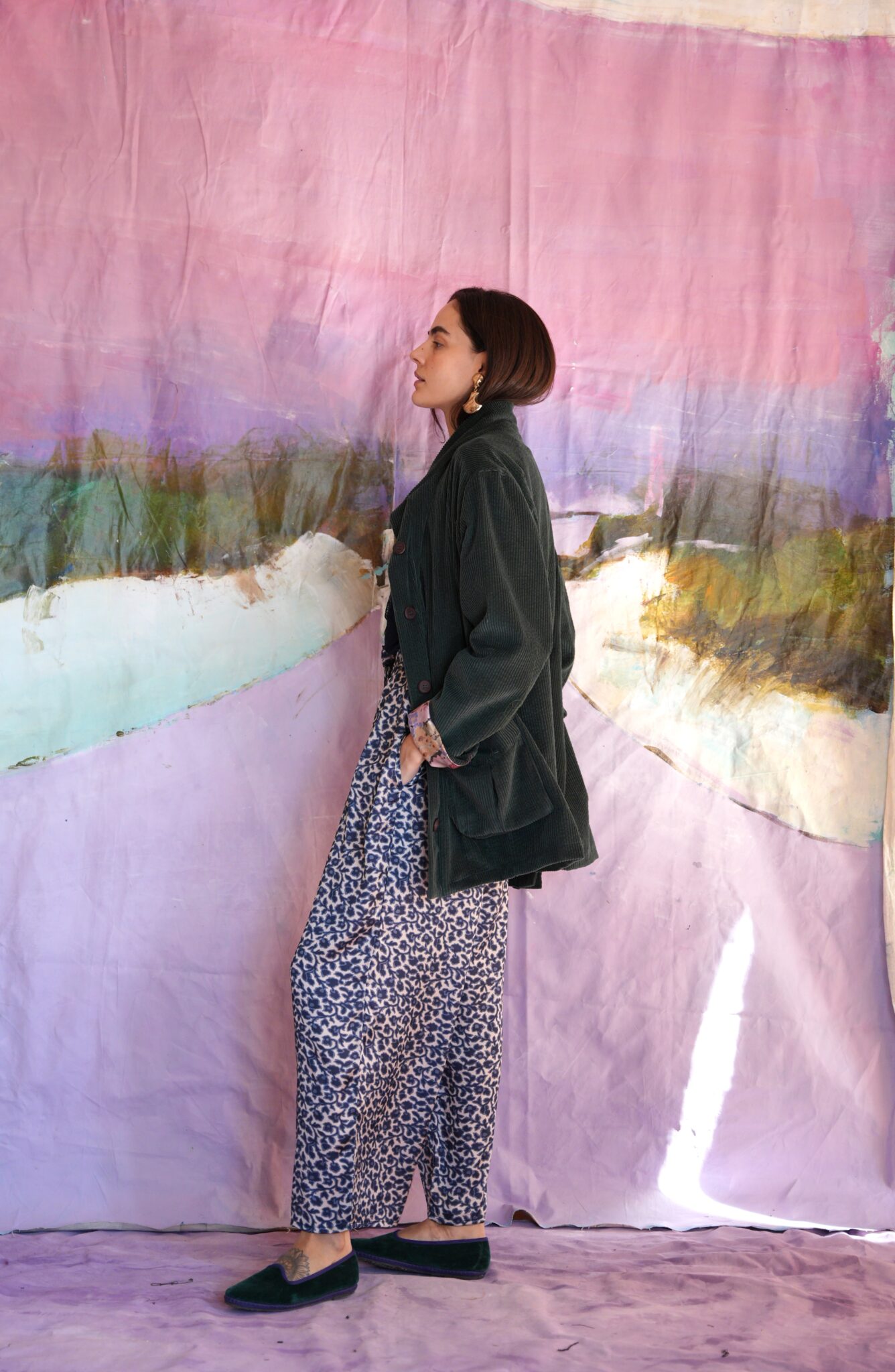 Oversize jacket with pockets on the sides, leather buttons and inner floral lining.