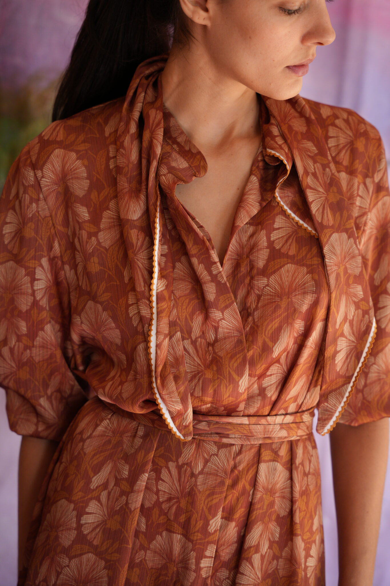 Maxi shirt-dress with mao neck,puffy 3/4 sleeves, belt and a little scarf