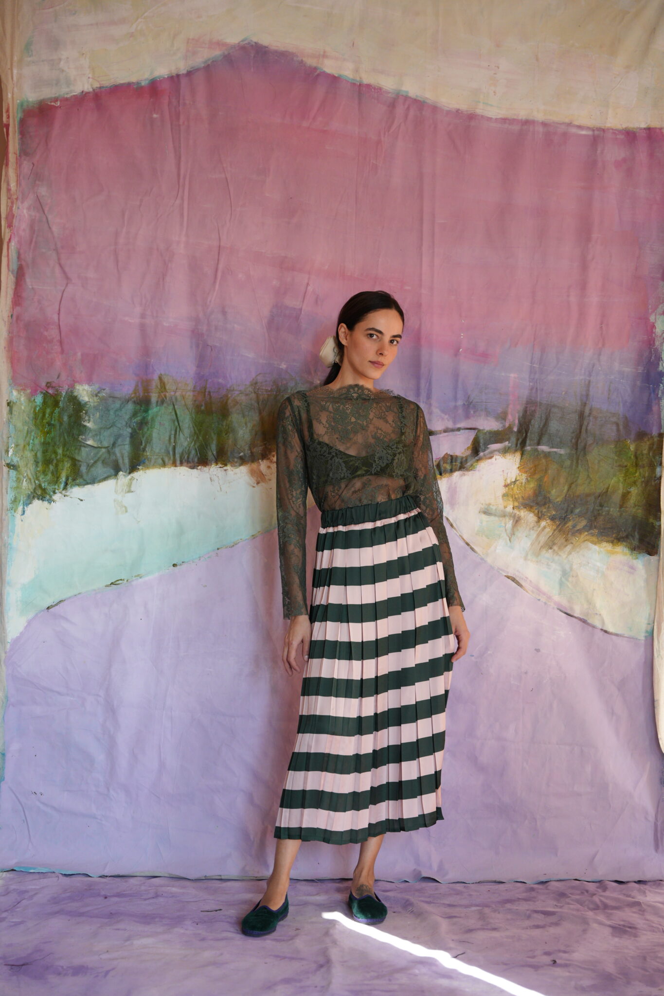 Μίντι πλισέ φούστα με λάστιχο στη μέση και ρίγες.