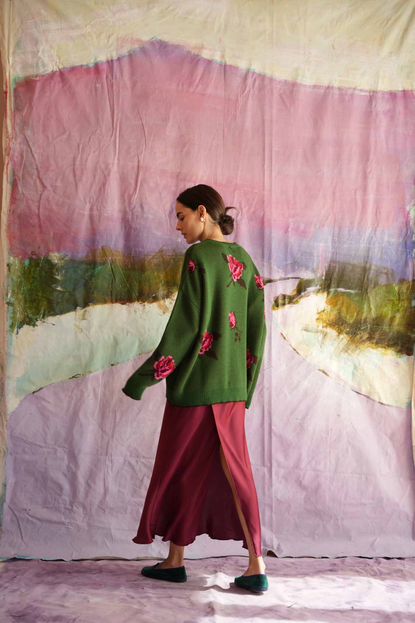 Midi ψηλόμεση satin φούστα με δύο ανοίγματα, ένα στο μπροστά μέρος και ένα πίσω.